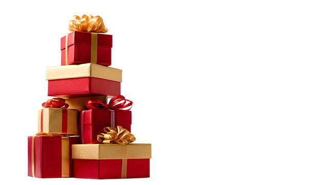 A vertical stack of red and gold Christmas gifts, each tied with a contrasting ribbon, creating a towering display. High-end product photography, clean lighting, isolated on white background.