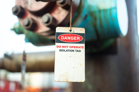 Isolation tag or lockout tagout which is hanged on pipeline valve that under maintenance, do not operate. Industrial safety sign object, close-up.