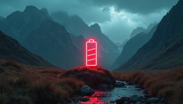 Red neon battery icon sits atop a rock in a vast mountainous landscape. A river flows nearby in the valley. The image conveys concepts of low energy, isolation, and technology within nature.