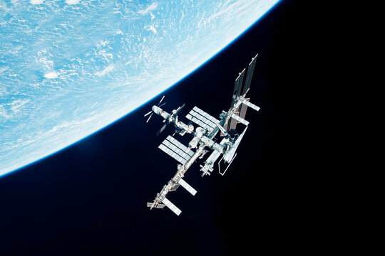 International space station in outer space. ISS on orbit of Earth planet. Space sci-fi collage with satellite and spaceship. Astronauts on orbit. Elements of this image furnished by NASA