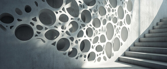 Concrete wall with cutout circular pattern, staircase beside it, creating modern architectural background, showcasing design and space