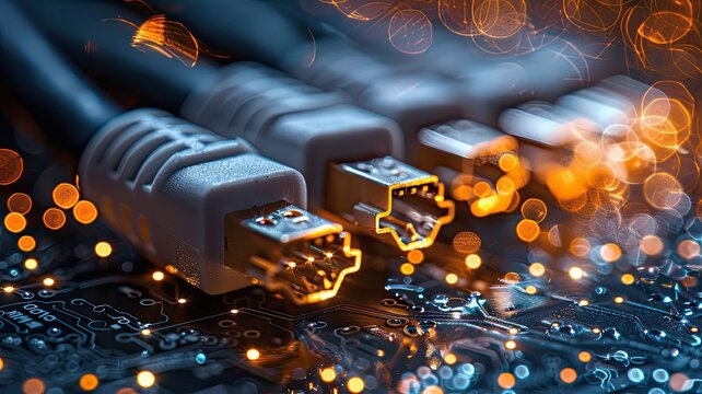 computer information technology networks, telecommunication Ethernet cables intricately connected to an internet switch, symbolizing the backbone of modern digital connectivity.