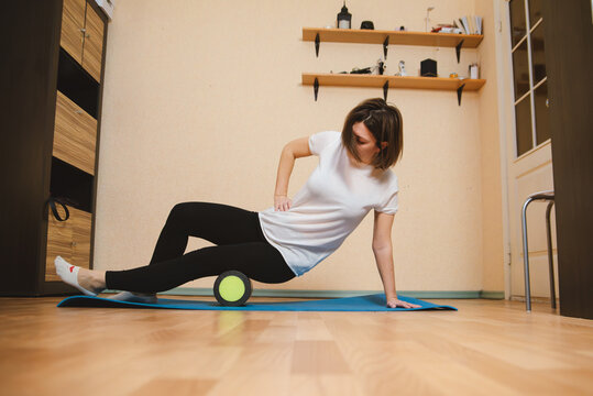 Woman performing foam roller exercise at home for muscle recovery.