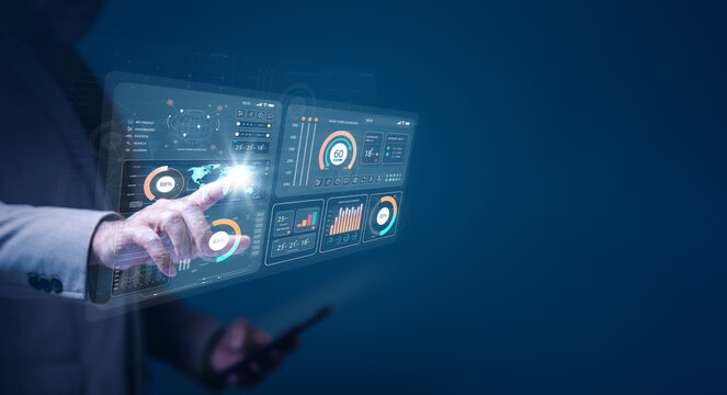 Data driven concept with businessman use virtual touchscreens with data in graphs and trends to make decisions and implement marketing strategies to reach more customers