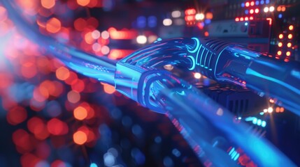 Modern data center with illuminated server racks and networking