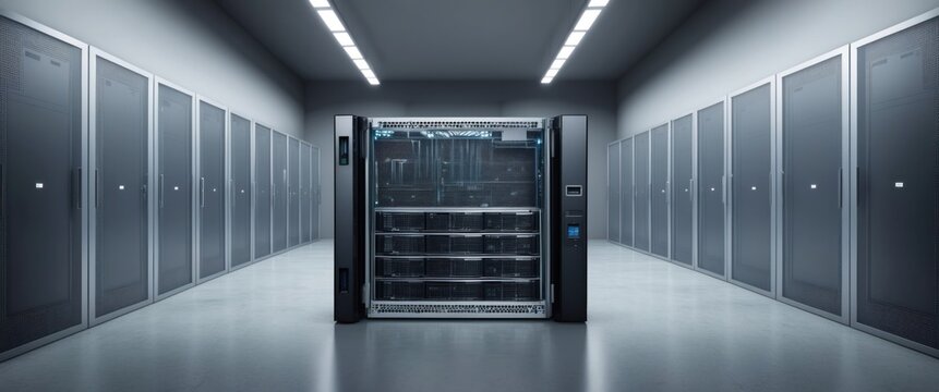 Server room with rows of rack-mounted servers. Supercomputer or mainframe. Data center. Cloud computing and big data storage. Artificial intelligence concept. Futuristic technology background