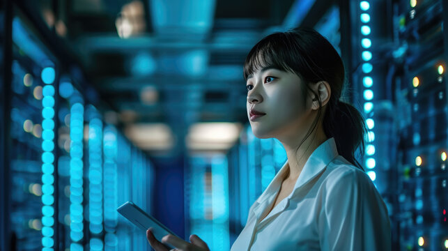 Female engineer analyzing data in high-tech server room