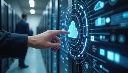Engineers managing data servers, cloud computing tech. Hand touches digital interface, analysing infrastructure, efficient server room environment. Secure data storage, virtualization, data