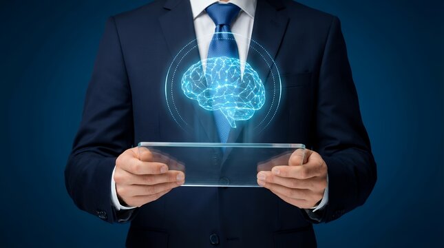 Businessman wearing a dark suit and blue tie holds a transparent digital tablet displaying a glowing holographic brain above it technology hologram intelligence innovation knowledge