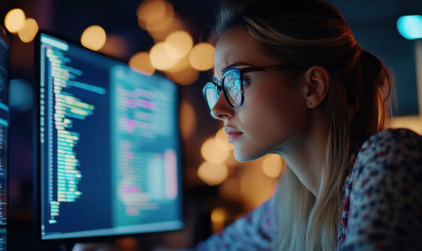 Focused businesswoman analyzing laptop data in modern office