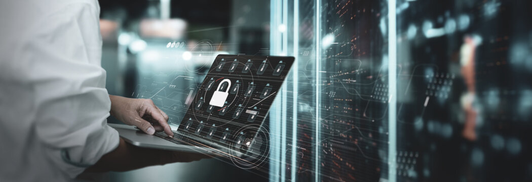 Digital Technology Connectivity in Cybersecurity with Business Professional and Holographic Interface in Server Room