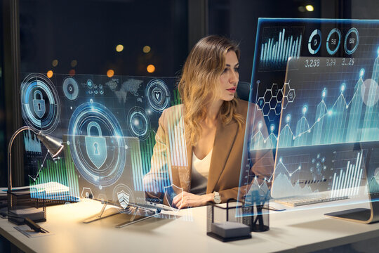 Professional Woman Working On Futuristic Data Analysis Displays And Digital Interface