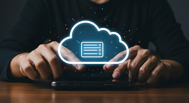 Person using a smartphone with a cloud icon and list symbol overlay for data management shown above it