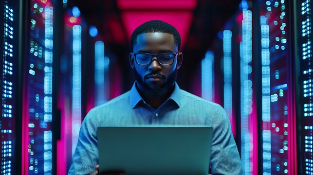 Modern IT professional managing data servers with laptop in a vibrant high tech data center, showing focus and expertise in technology solutions