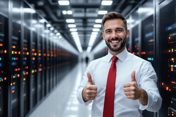 Confident man in business attire giving thumbs up in a modern server room with glowing lights, futuristic background, concept of success. Ai generative