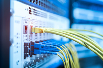Server room interior featuring rows of glowing computer racks with blue, orange lights. Modern data center infrastructure highlights networking, digital cyberspace, technological progress for