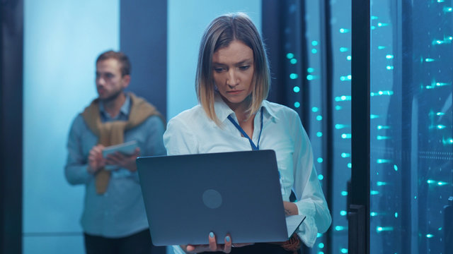 Woman IT administrator checking rack server hardware doing transparent data transfer working on laptop computer in data center secure storage. Female professional.