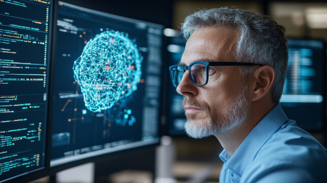 focused man analyzes data on multiple screens, showcasing digital brain visualization. atmosphere is high tech and innovative, reflecting advancements in artificial intelligence