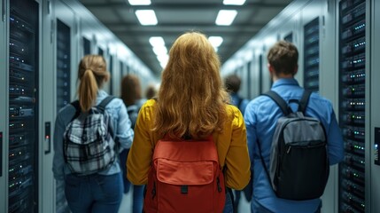 Students explore modern data center hallway with server racks, glowing lights. Young people learn about computer infrastructure, technology systems. Future IT professionals gain practical insights.
