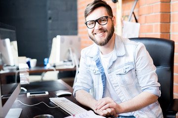 Portrait of handsome creative businessman looking at camera with arms crossed in office