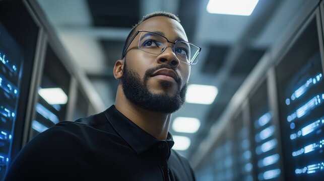 It professional analyzing data in advanced server room environment