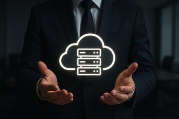 Businessman holds a glowing cloud above his hand, representing cloud computing, data storage, and technology.
