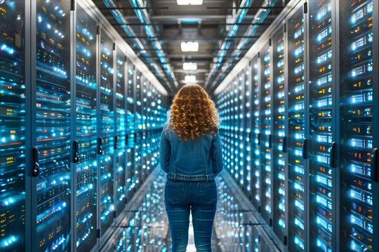 Woman in Denim in a High-Tech Server Room for Cybersecurity and Data Management Imagery