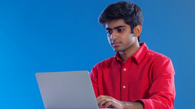 In a blue studio environment, a young Indian IT professional in a red shirt works on his laptop. The casual attire and isolated setting highlight his intense focus on his tech work.