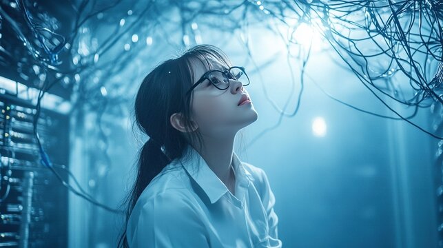 Female engineer in data center managing cables, blue light glow, emphasizing cybersecurity and data flow in contemporary IT environment