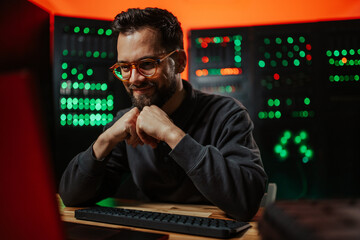 Smiling data center IT professional using artificial intelligence neural networks technology on PC. Happy server farm admin using AI programming language on computer to update hardware