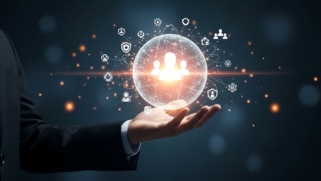Modern professional business environment with innovative digital technology, corporate teamwork, strategic leadership, and advanced data security solutions