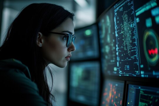 focused student coding on computer in classroom setting, surrounded by screens displaying programming languages