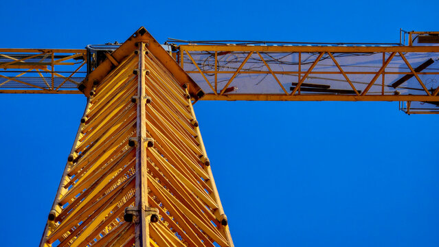 A yellow crane is standing tall against a blue sky. The crane is old and rusted, but it still stands strong. Concept of strength and resilience, as the crane has weathered the test of time