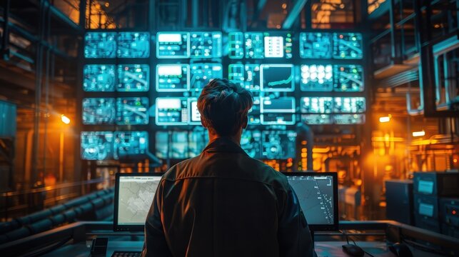 Engineer Monitoring High-Tech Control Room with Multiple Screens and Advanced Technology Systems