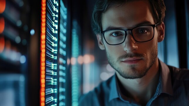 Professional Male IT Programmer Analyzing Data in High-Tech Server Room with Coding Interfaces and Advanced Technical Equipment