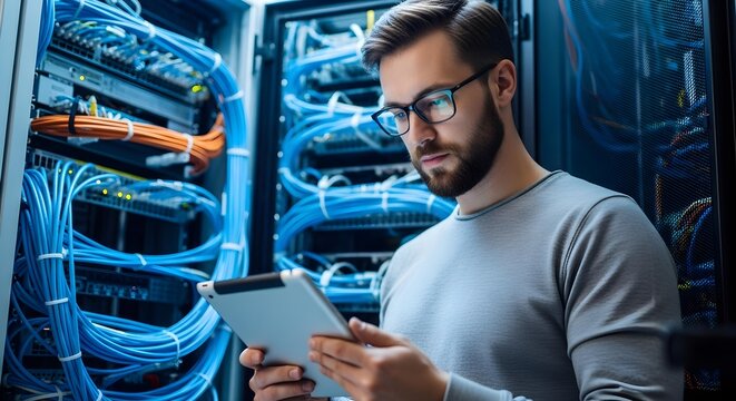 Young IT specialist inspecting network server rack using tablet in bright data center room. Technology and communication science concept.