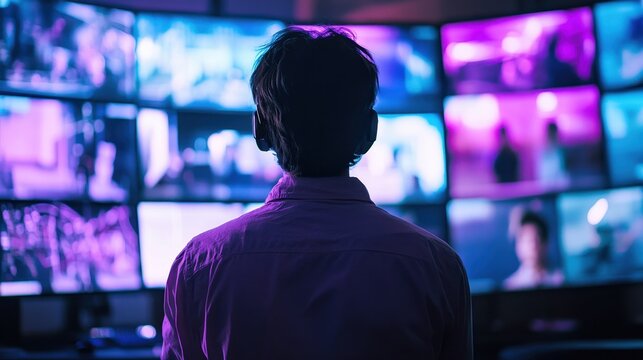 High-tech operator analyzing data in futuristic control room with glowing screens. Generative AI