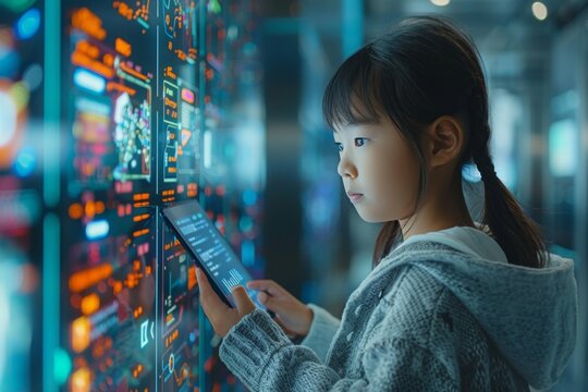 woman in futuristic data center works on glowing screen filled with data and code, tech professional or hacker in a cyberpunk, neon-lit world