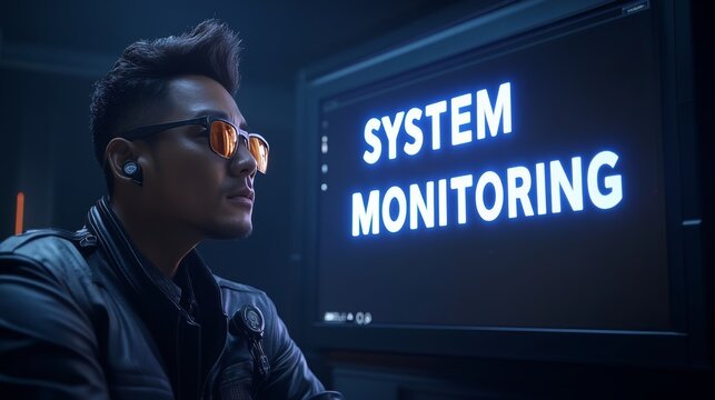 Concentrated IT Expert Monitoring Network System Performance, Glowing System Monitoring Text Overlay
