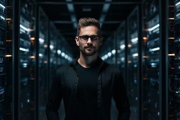 It engineer standing in the corridor of a data center next to server racks