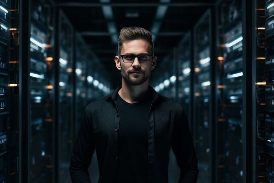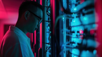 Close up portrait of technician working in server room, focused on tasks. environment is illuminated with blue lights, showcasing technology and expertise