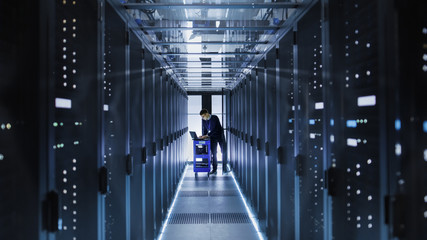 Administrator Working With Data Protection Engineering Network for Cyber Security in data center, Server Farm Cloud Computing Facility with System. AI, IT