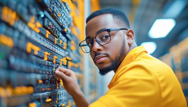 Administrator Working With Data Protection Engineering Network for Cyber Security in data center, Server Farm Cloud Computing Facility with System. AI, IT
