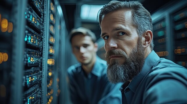 Portrait of an IT expert troubleshooting server issues, focused and analytical, server racks in the background