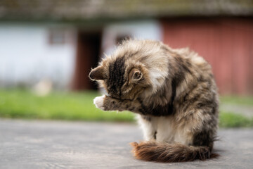 a beautiful fluffy cat washes itself in the yard