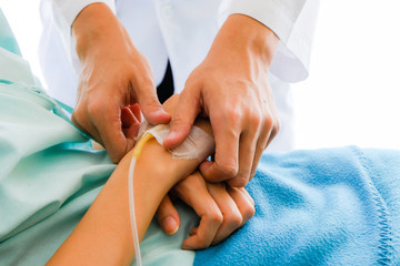 A doctor in sterile gloves inserts a dropper needle into the patient's hand.
