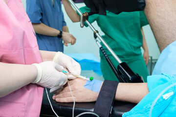 The doctor inserts a catheter into a vein in the patient's wrist to administer drugs during surgery. The doctor's hands in sterile gloves insert the needle into the patient's arm.