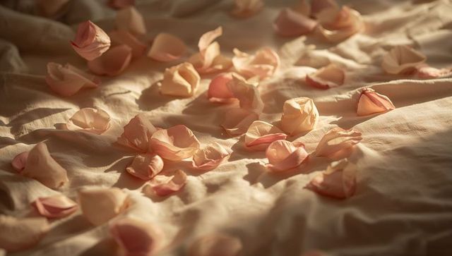 Resting pale pink rose petals on cream linen bathed in warm sunlight