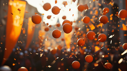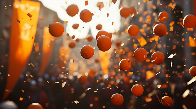 Slow-motion depiction of oranges flying through the air, capturing the energy and chaos of the Battle of the Oranges
