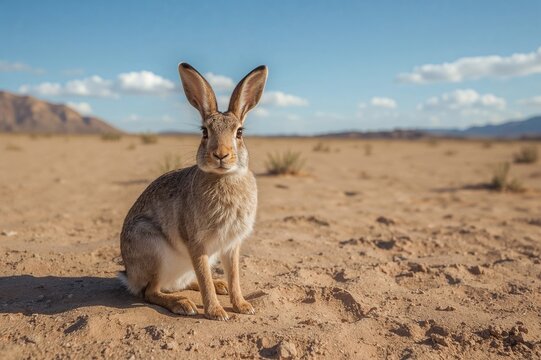 A stunning black-tailed jackrabbit rests on sandy terrain in a desert spring area